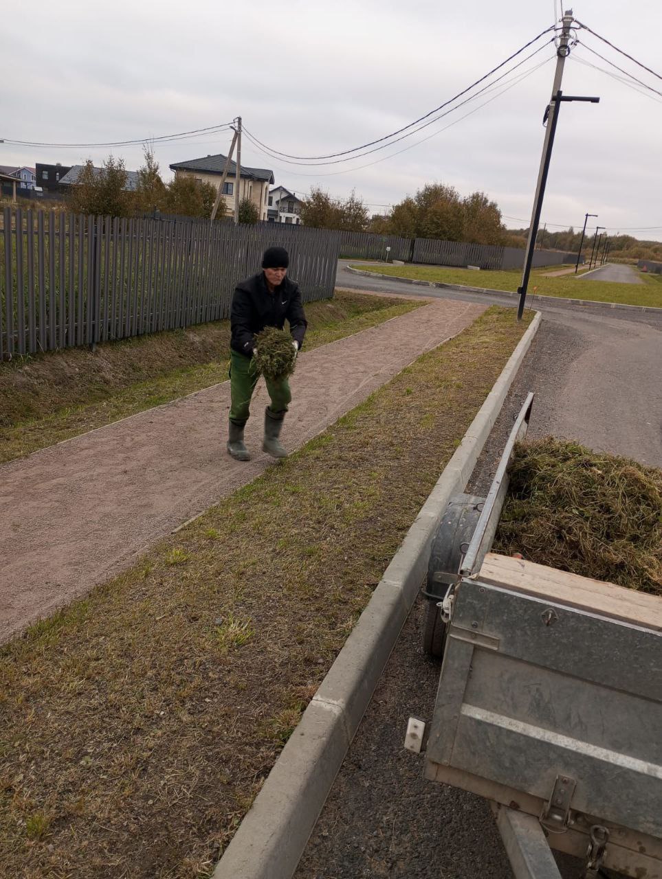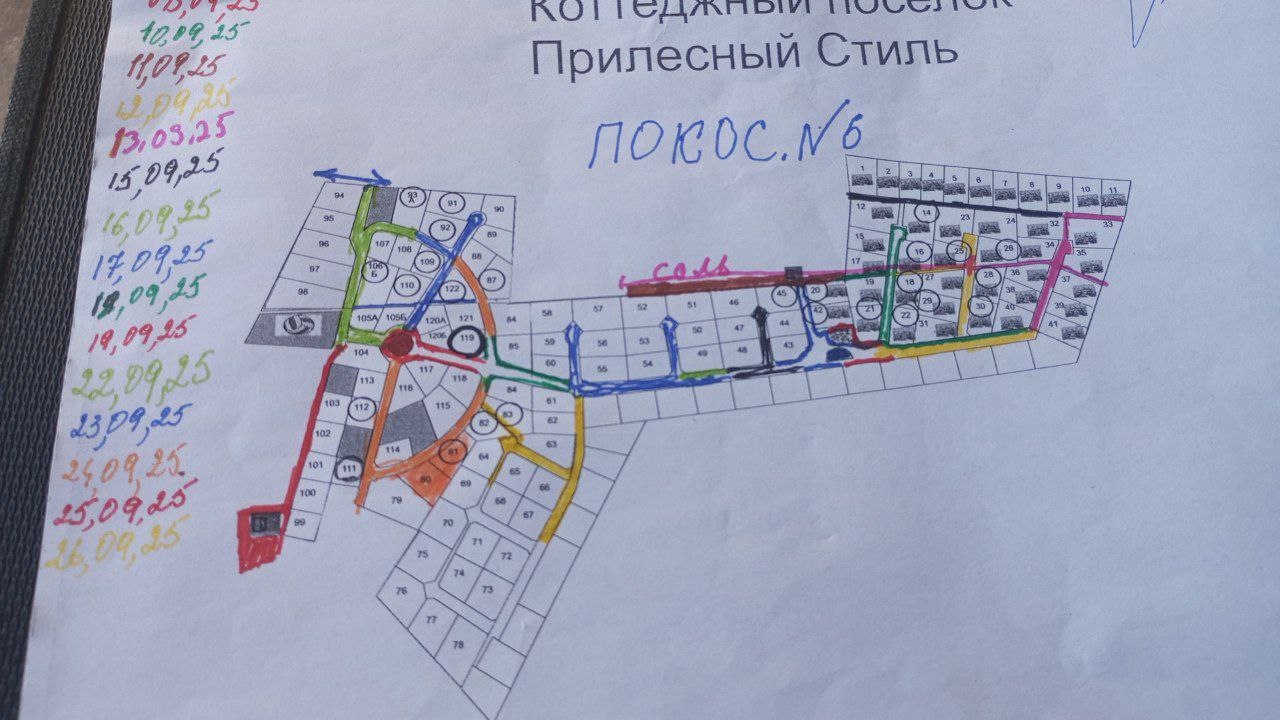 Выполнена уборка территории: сбор мусора на внутрипосёлковых проездах и дренажных канавах, детской площадке, общей территории посёлка, у контрольно-пропускного пункта — собрано 5 м³ летающего строительного и бытового мусора, песка и ила с дорог 2 м³.