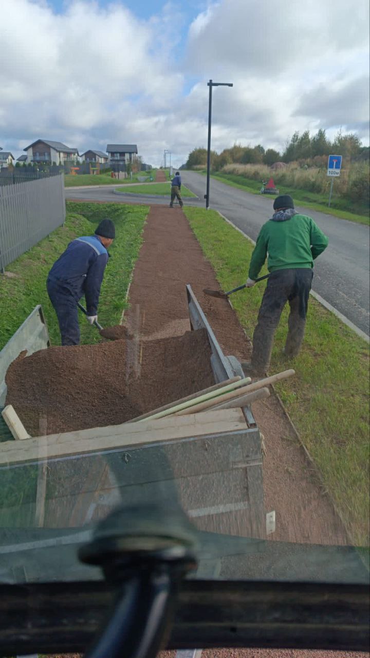 Выполнено обновление отсева на тротуарах и дорожках посёлка: израсходовано 10 м³ отсева.