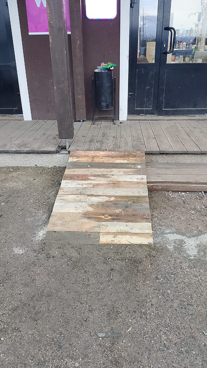 Смонтирован временный пандус для заезда в магазин посетителей с колясками.