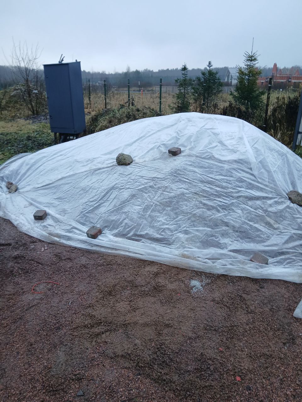 Укрыта полиэтиленовым тентом насыпь антигололёдной смеси.