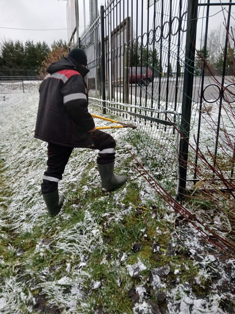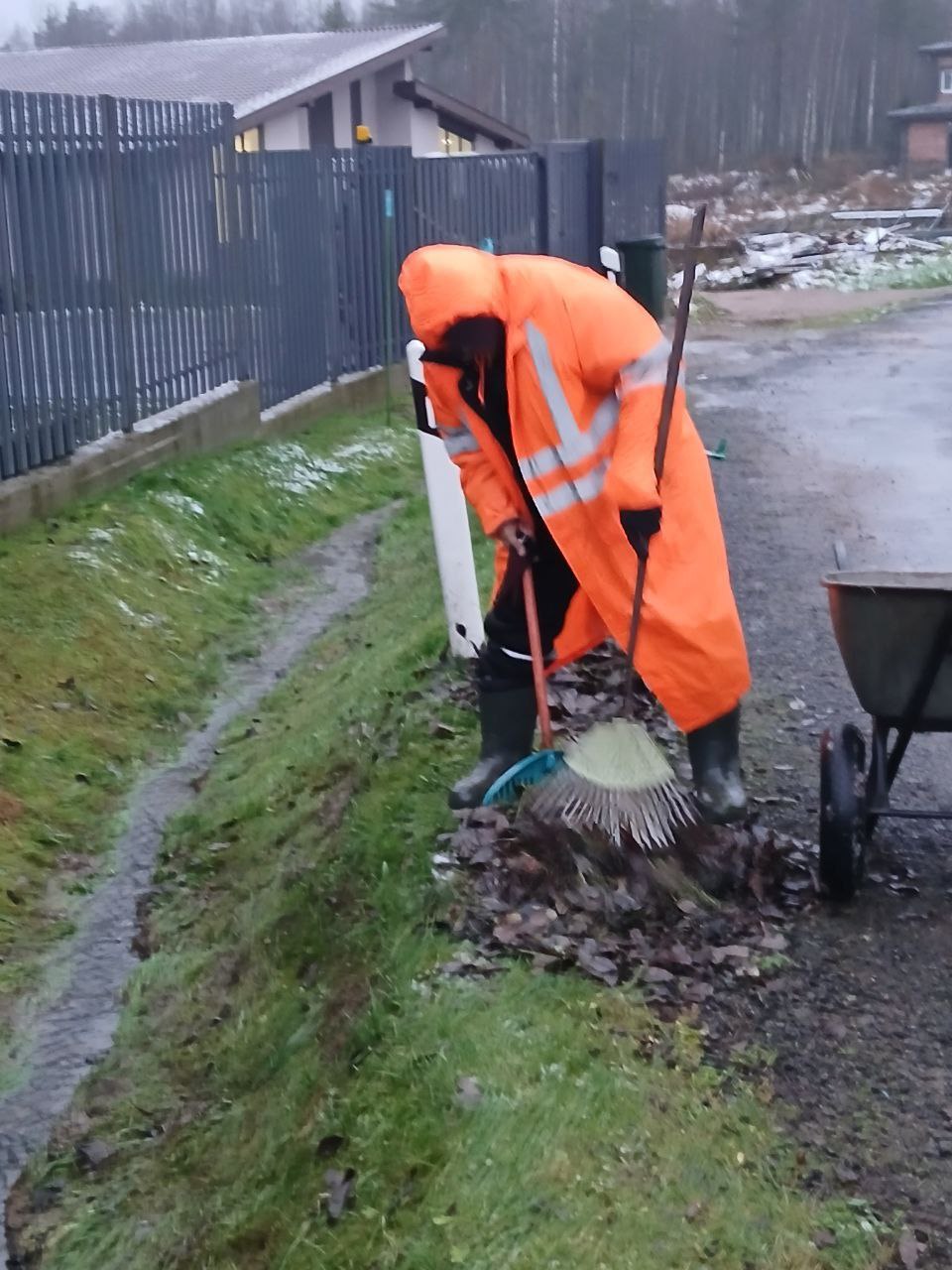 Выполнена уборка территории - сбор мусора и опавшей листвы на внутри поселковых проездах и дренажных канав, детской площадки, общей территории посёлка, у контрольно-пропускного пункта. Собрано 0,6 м³.
