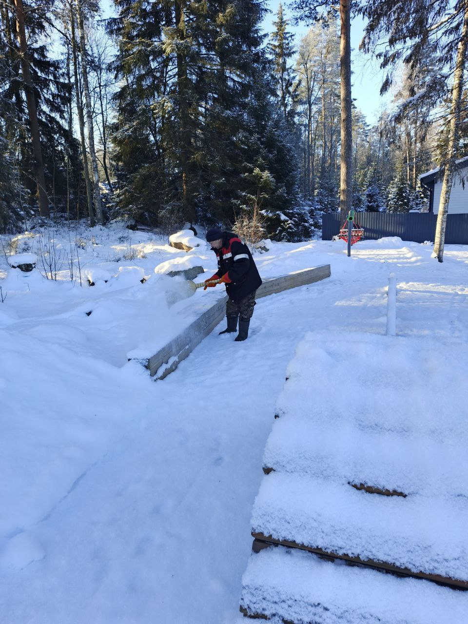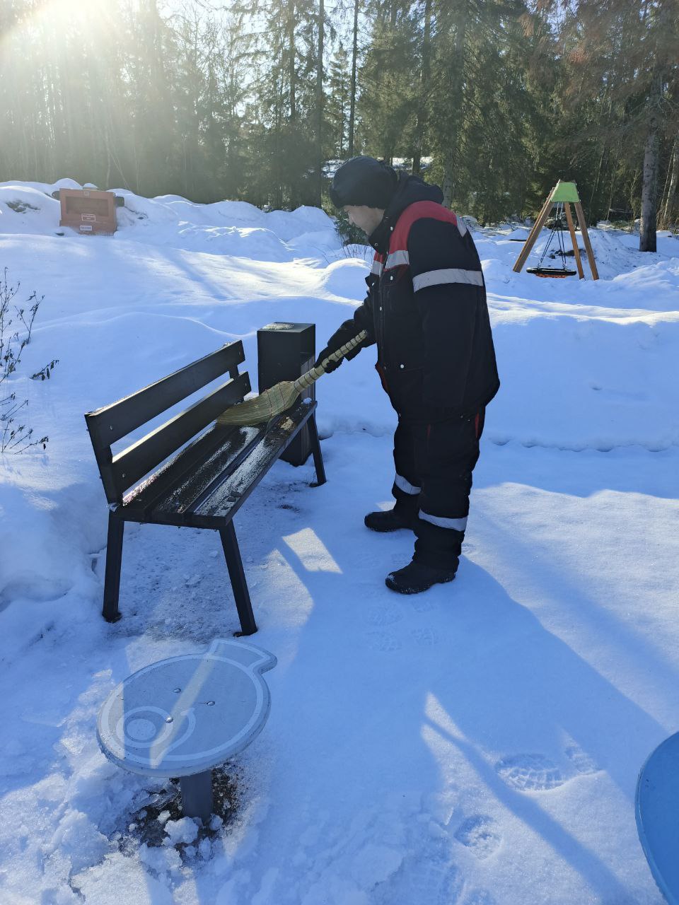 Очищена от снега территория и малые архитектурные формы на детской площадке.