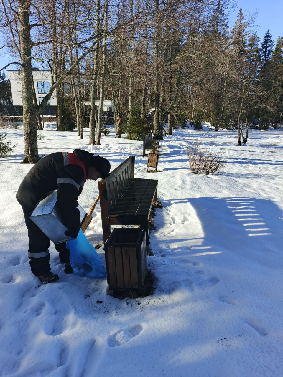Очищена от снега территория и малые архитектурные формы на пляже.