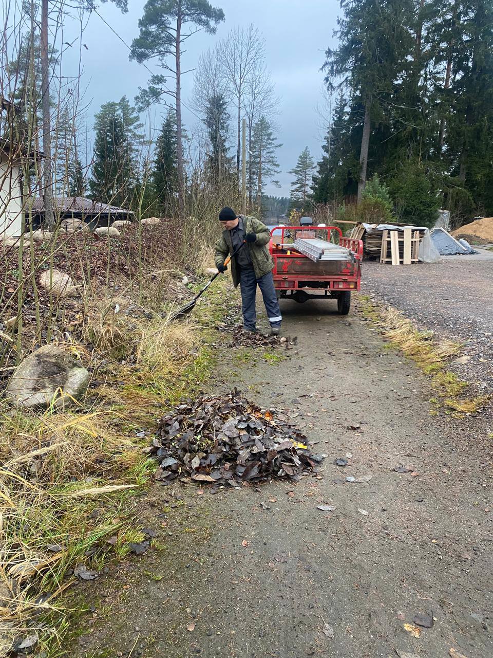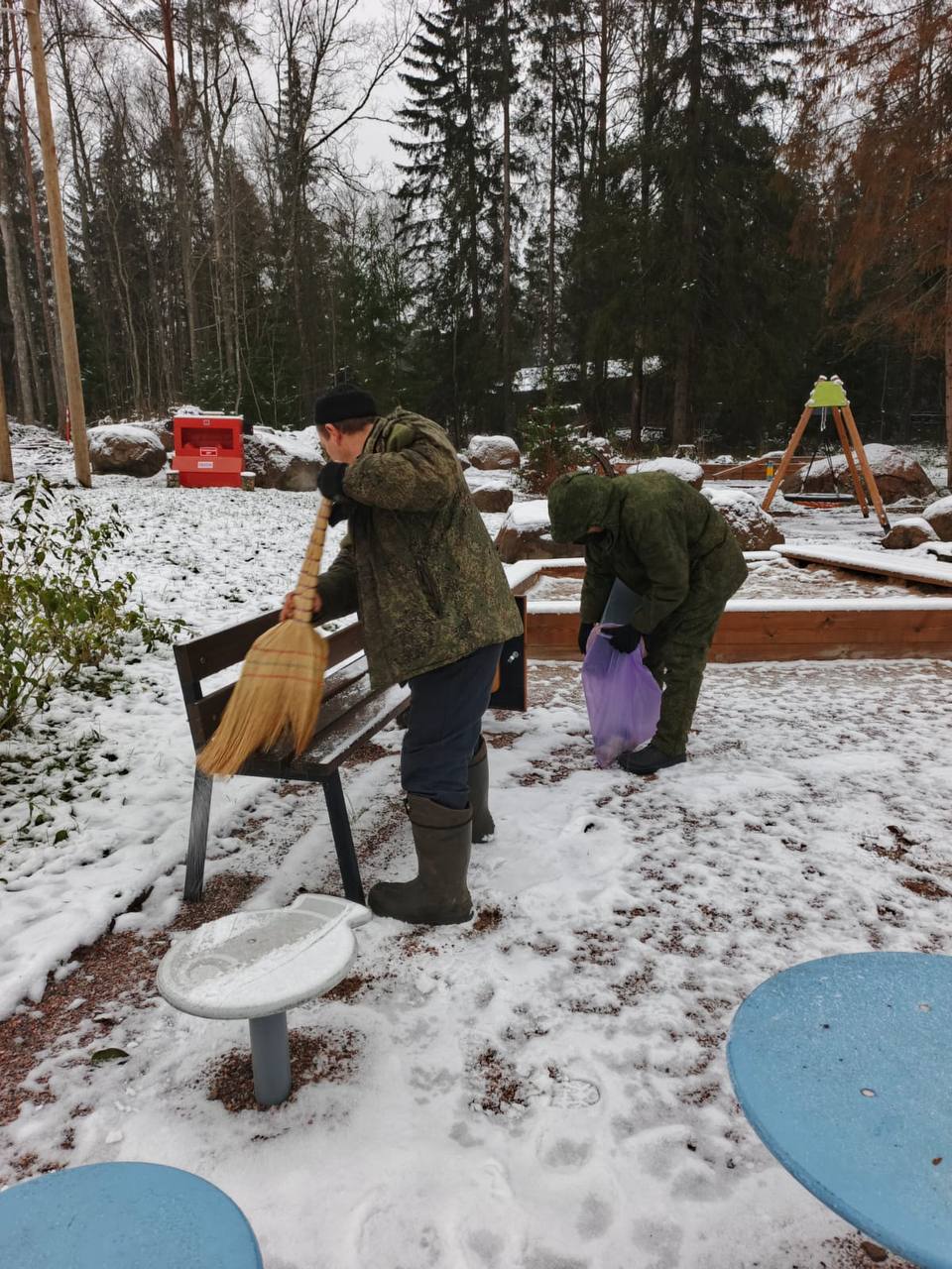 Регулярно, в течение месяца производилась очистка дорожного полотна и территории детской площадки от опавшей листвы и иголок хвойных деревьев.