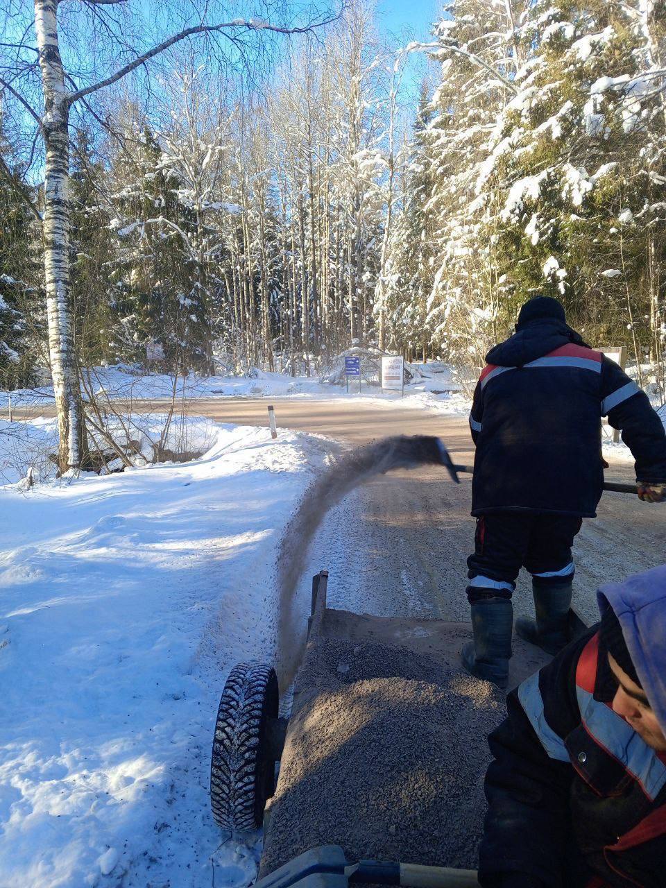 Выполнена отсыпка противогололёдным средством (отсев) опасных участков на подъездной дороге к главному контрольно-пропускному пункту — 0,1 м³.