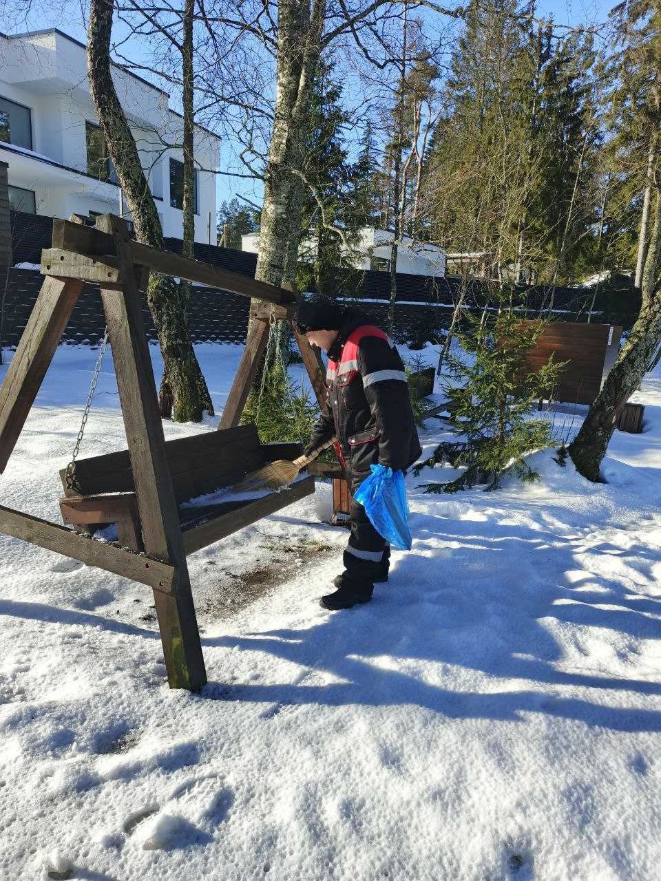 Очищена от снега территория и малые архитектурные формы на пляже.