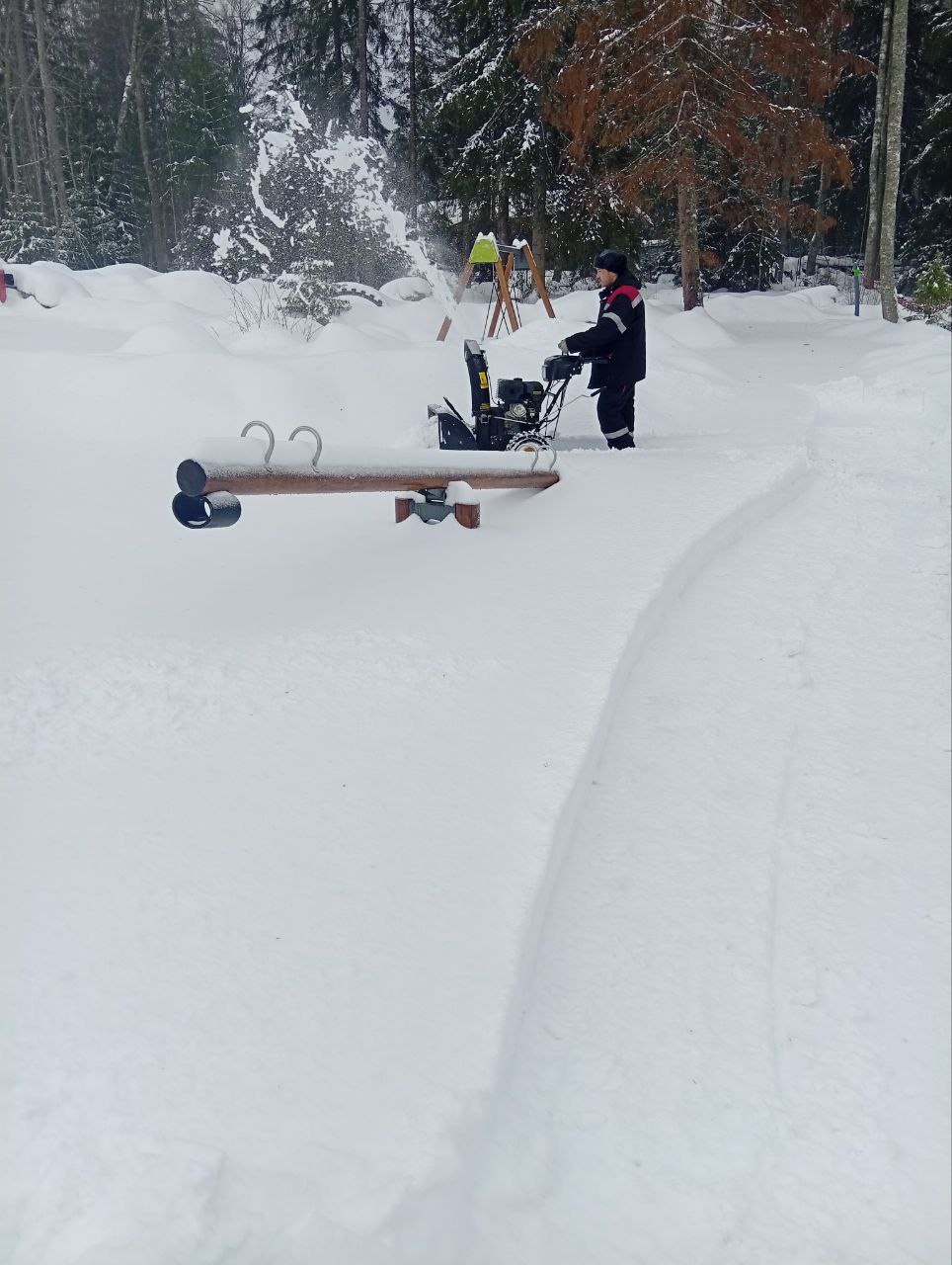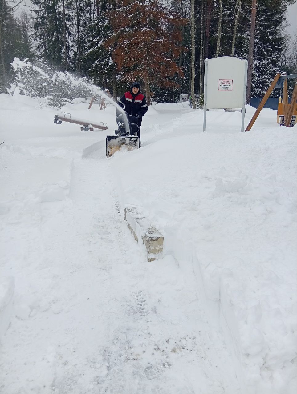 Очищена от снега территория и малые архитектурные формы на детской площадке.