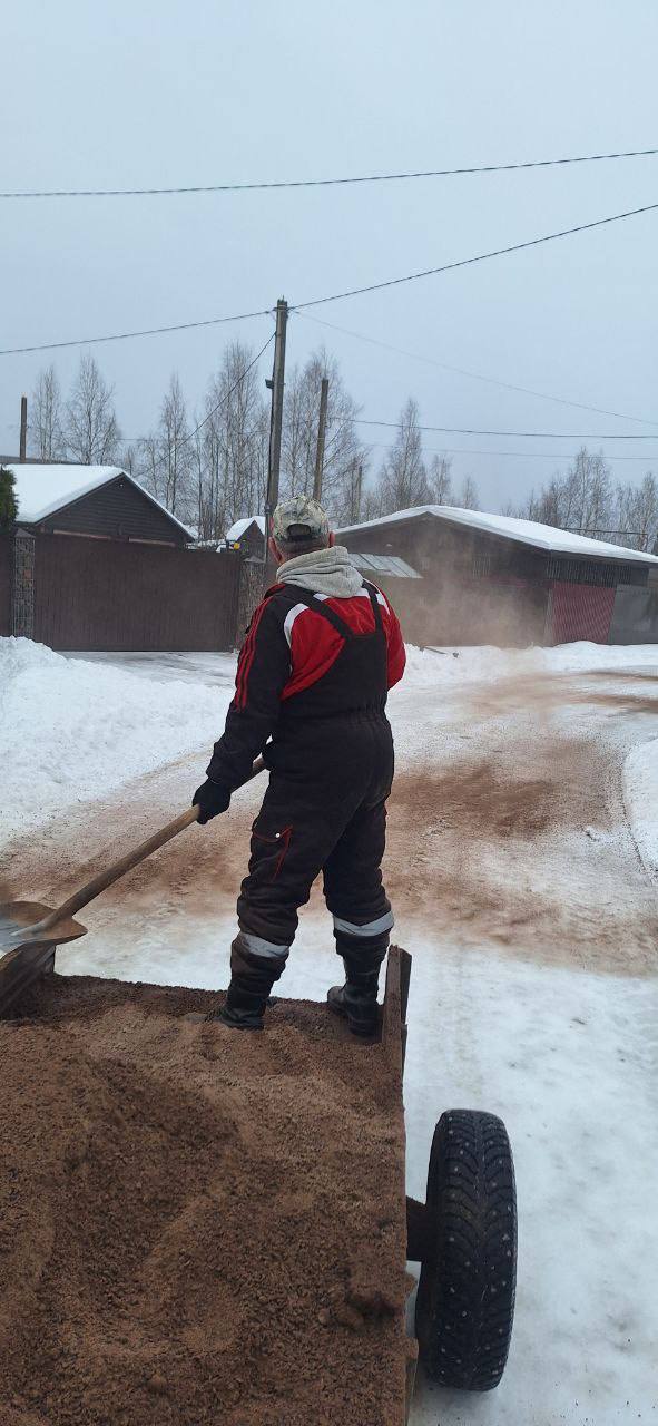 Проезды в коттеджном посёлке Кокосы посыпаны противогололёдным средством (отсевом): перекрёстки, опасные участки и искусственные дорожные неровности.